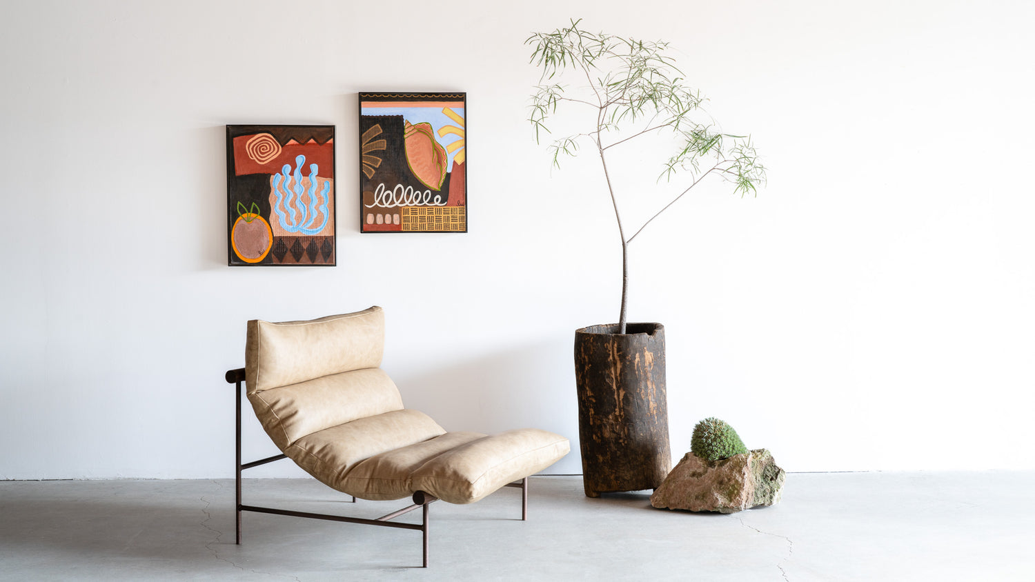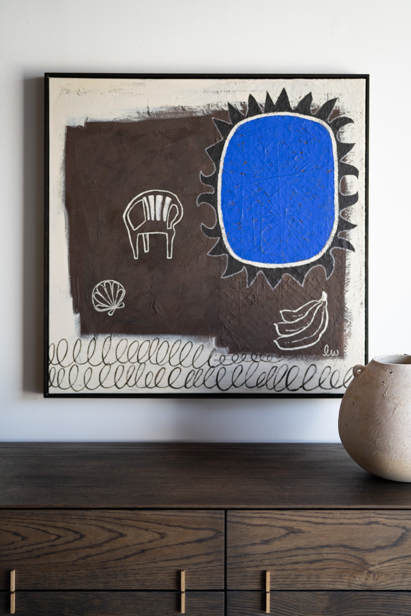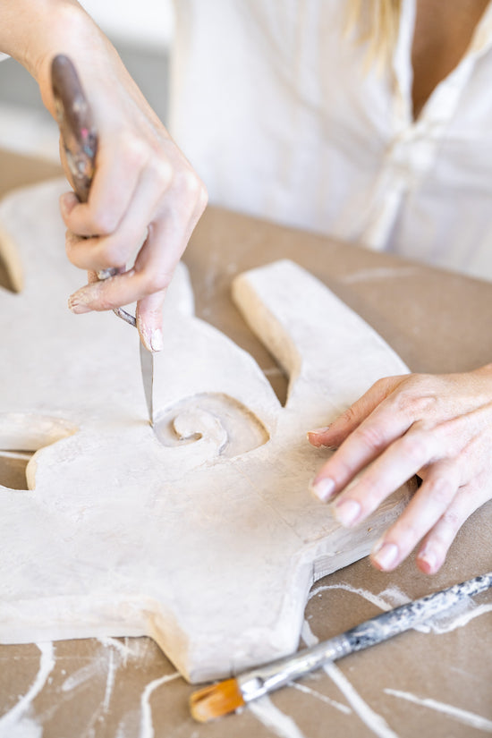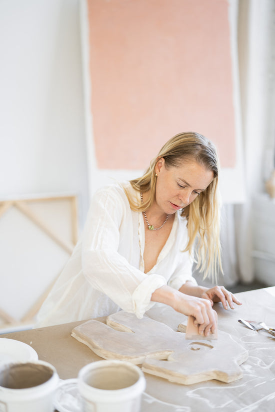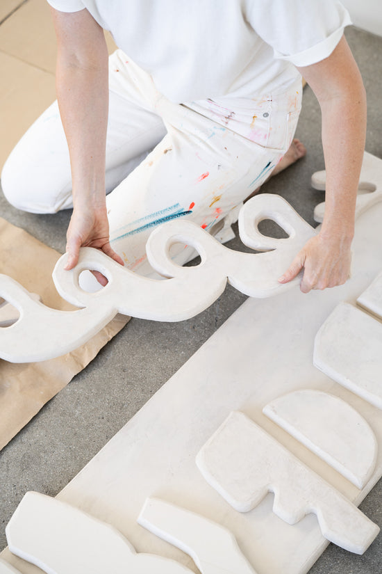 LW // “Totem”, a piece that I created specifically for Croft House, holds a special space in my heart. I got to collaborate with my Dad who is a really talented woodworker. He helped me to carve a series of organic shapes out of maple wood and then I covered them in many layers of plaster for a ceramic look and feel. Discovering this new technique meant that there were so many failures along the way. We both learned so much and it made the final result that much more meaningful!