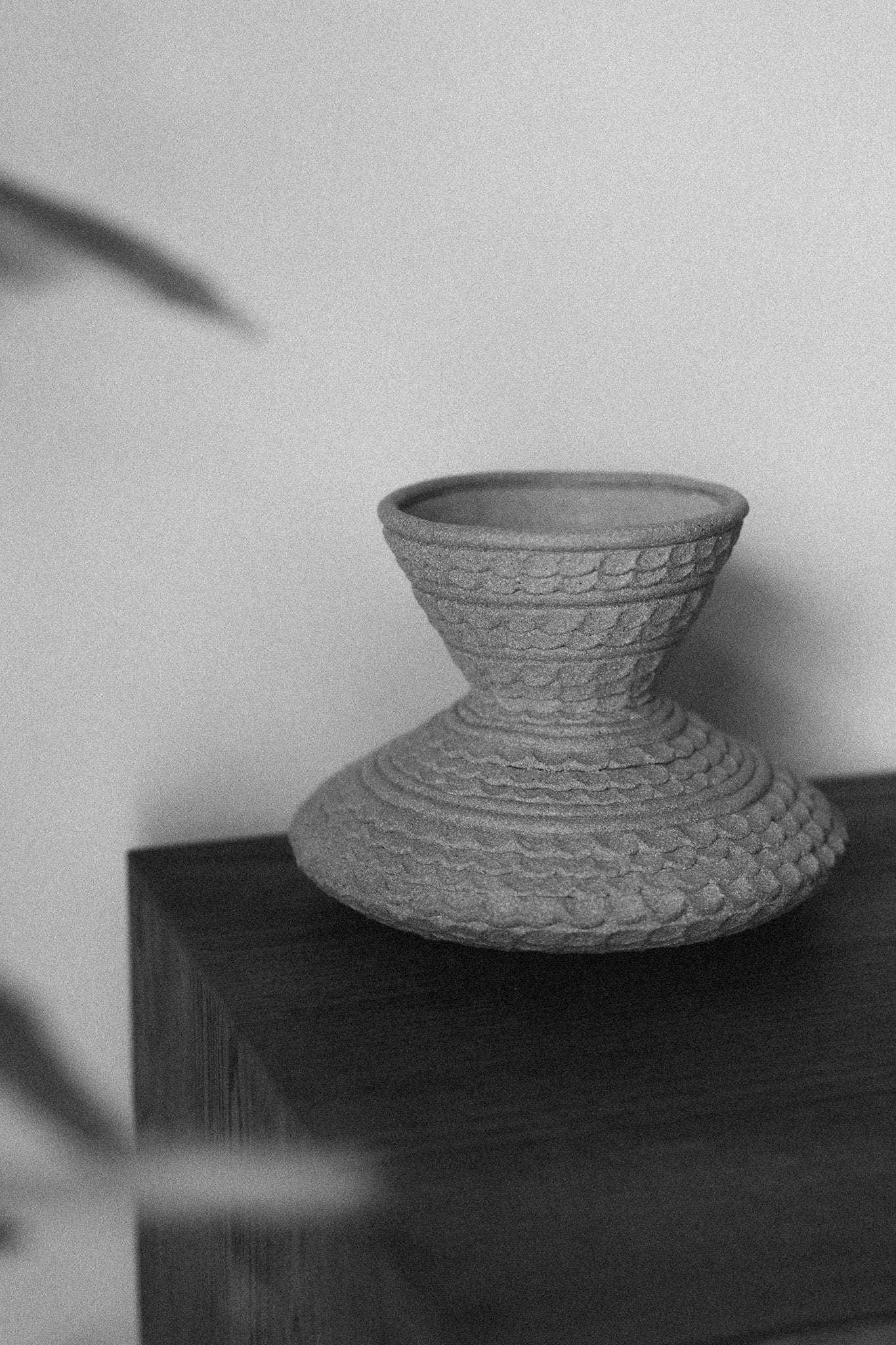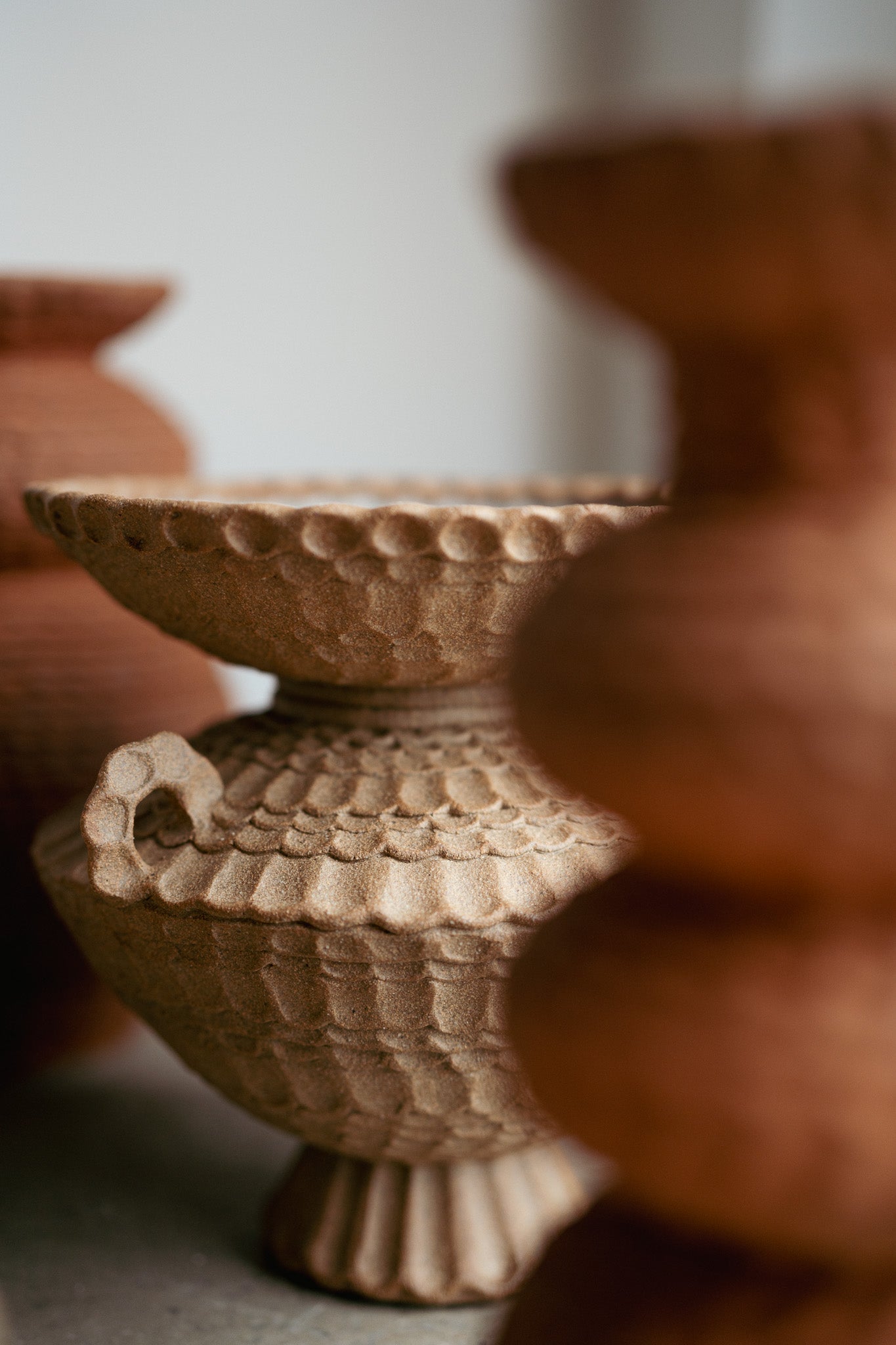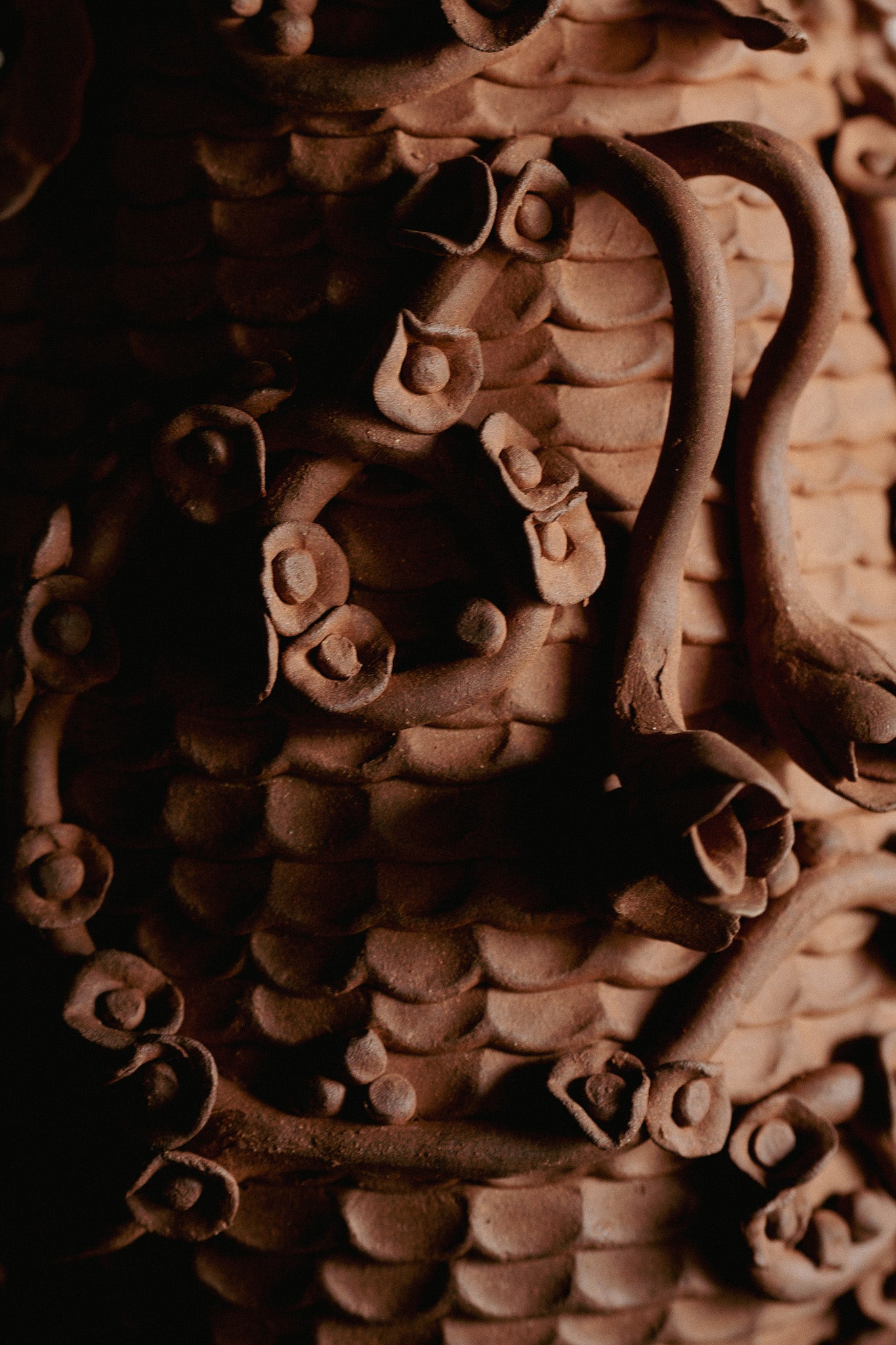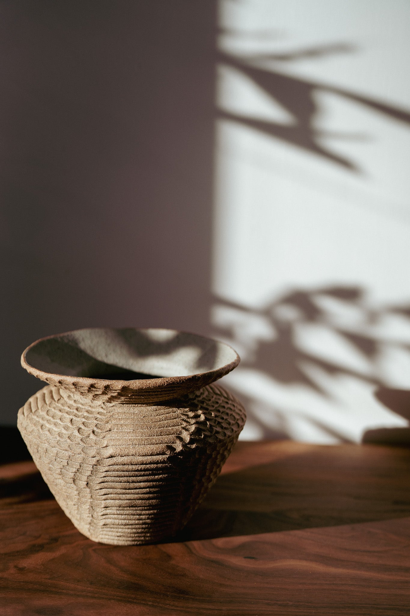 CG // I look a lot to ancient Greek and Roman vessels for inspiration on shapes, and I love learning about what shape vessel was meant for what purpose and the rituals around their use. Often when making, I try to let the coils lead in designing the overall texture of the piece, looking to the next layer of finger printed coils to inspire what will sit best against the previously created texture.